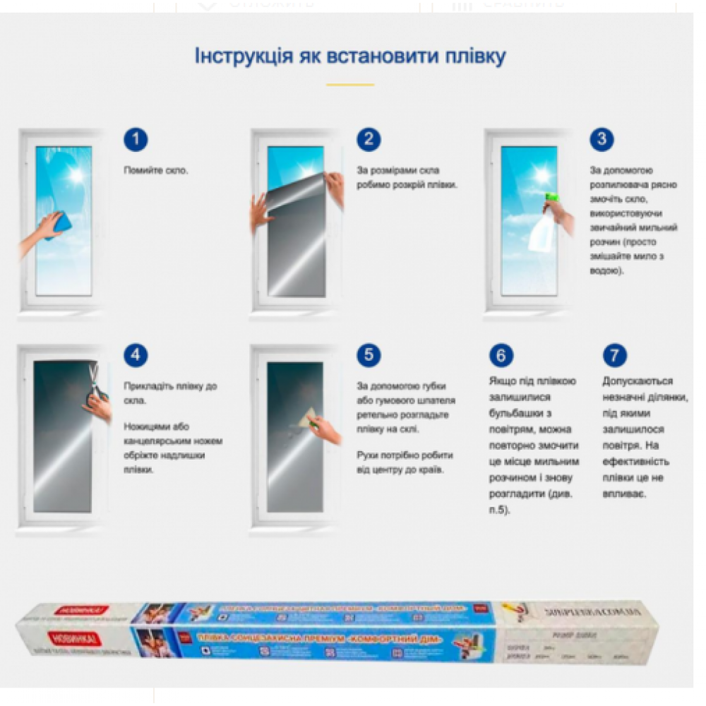 Клеїться на скло за типом автомобільної плівки, поставляється в картонній коробці (боксі). Ефективно захищає від сонця та ультрафіолетових променів.