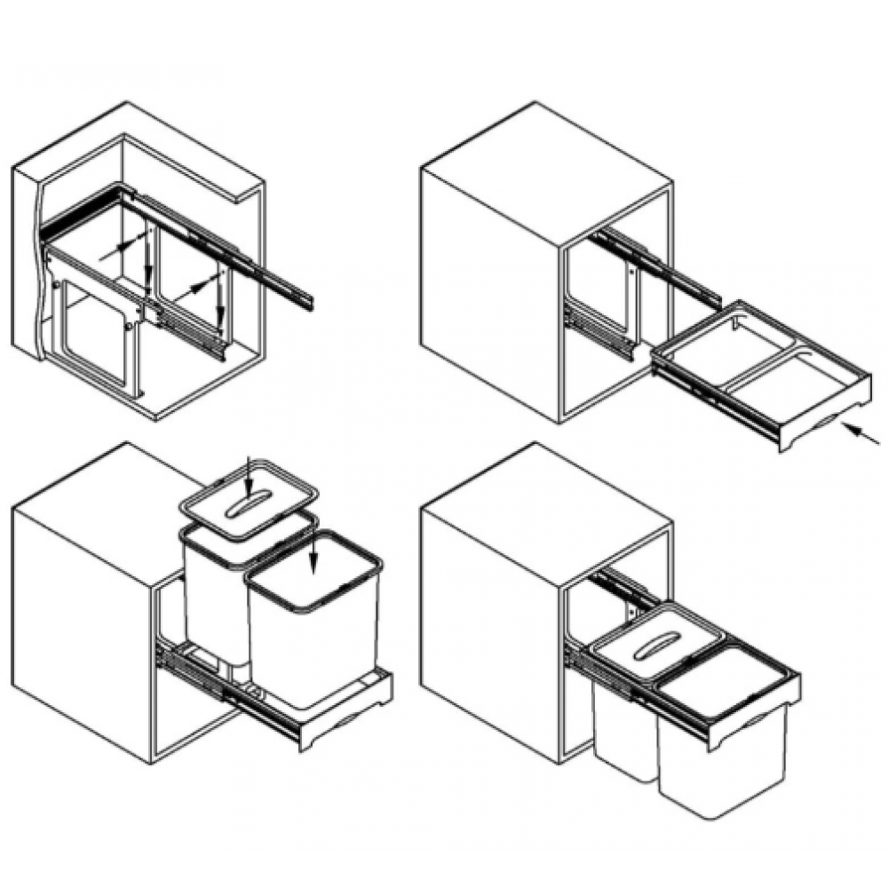 Комплектація: два контейнери зі знімними внутрішніми відрами, каркас із вбудованими напрямними, знімна кришка для одного відра, набір кріплень.