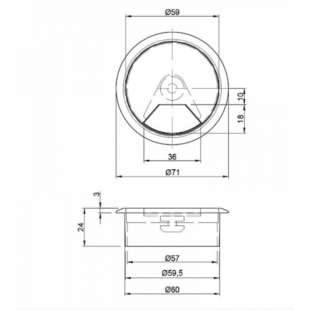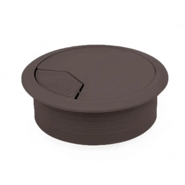 Складається заглушка з двох частин, кругла основа (60 мм діаметром, під фрезерування) з отвором і плоска, кругла пластина, яка знаходиться всередині основи і закриває отвір, за потребою. Призначена вона для того, щоб заглушити отвір, який робиться в меблів для проведення проводів. Наприклад комп'ютерний стіл, там просто потрібно вивести дроти для техніки, для цього робимо отвір 60мм, після чого вставляємо заглушку, проводимо крізь неї дроти, регулюючи розмір отвору заглушкою.