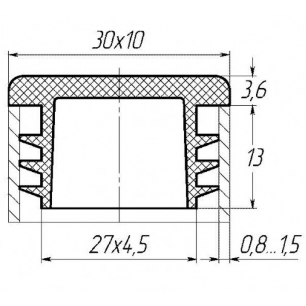 Заглушка прямокутна 10мм x 30мм підходить для труб із товщиною стіни 0,8 - 1,5 мм.