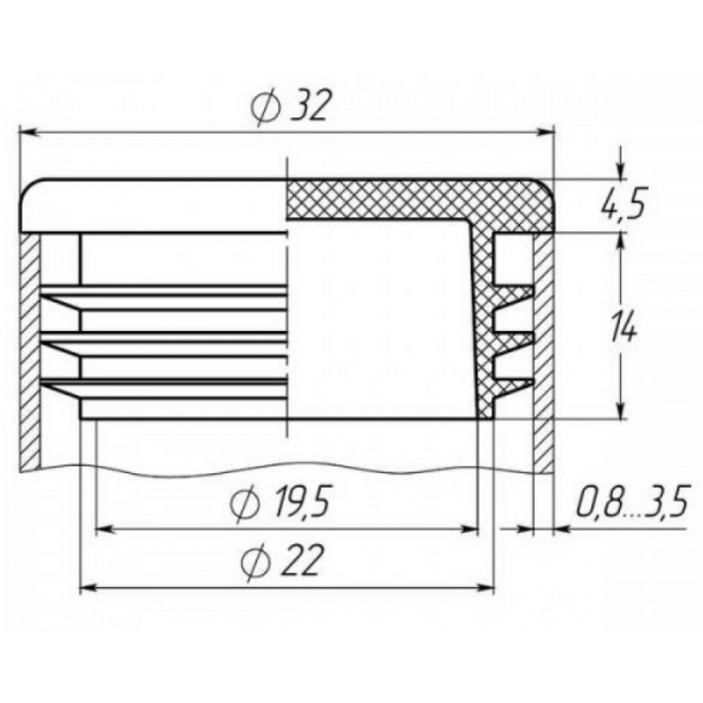 Пластикова заглушка діаметром 32 мм підходить для труби з круглою формою перерізу з товщиною стінки 0,8 – 3,5 мм.